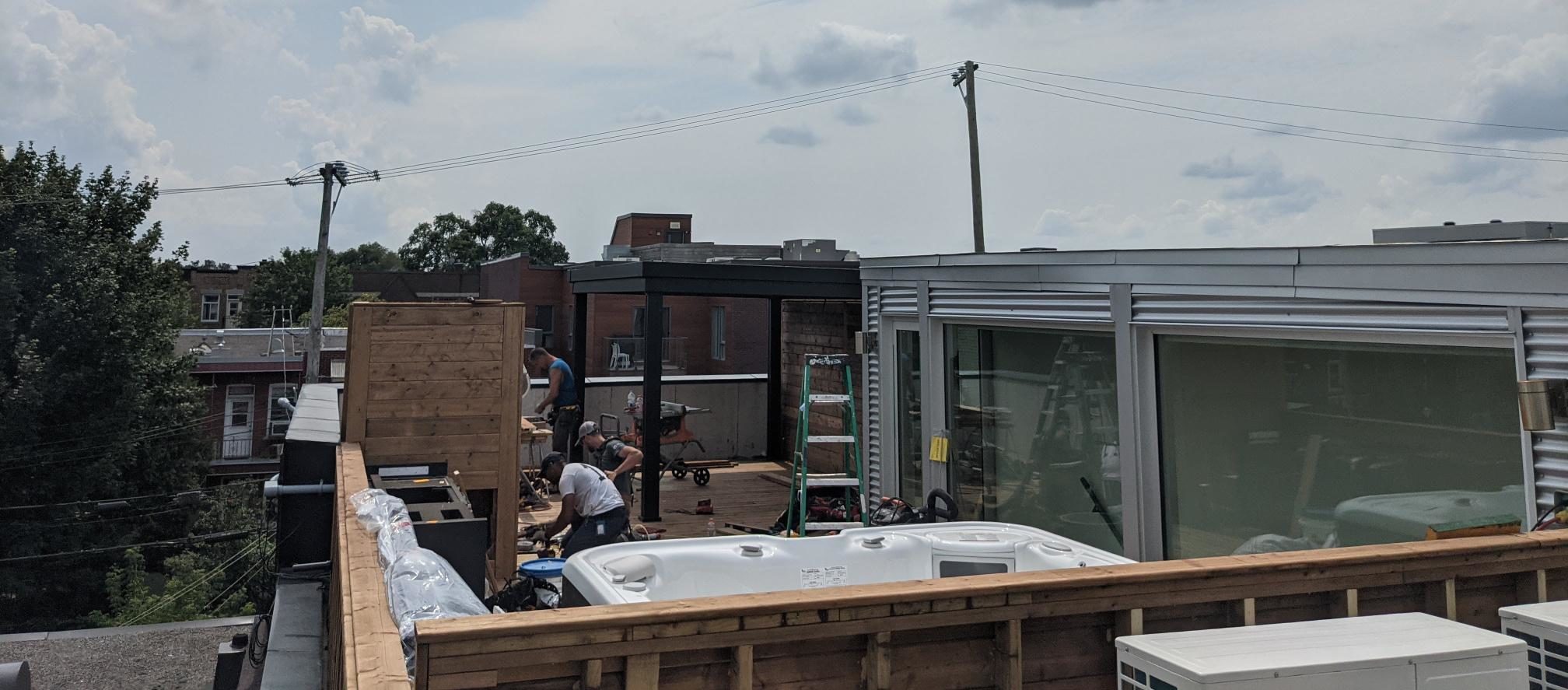 Ce projet consistait à complètement réorganiser et agrandir la terrasse sur le toit d’une maison unifamiliale dans le quartier Parc Molson. Les propriétaires voulaient que la terrasse ait plusieurs fonctions : Un coin détente, un coin repas et un coin pour accueillir un SPA.